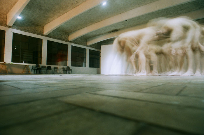 A dança organiza-se pelos dispositivos coreográficos: paquerar, expor, tocar, círculo e porosidade com o espaço e o público. Os estados corporais passam a ser investigados na construção de si através do outro, criando uma corrente de alteridade. Buscando por um corpo coletivo que esquiva de um líder, doutrina ou instância que hierarquize as relações em jogo, evitamos inclusive que a própria movimentação dos artistas acabe virando o centro e a autoridade, por isso a necessidade de reinventar-se, criando estratégias para não cristalizar numa estrutura fixa que determine os fluxos.